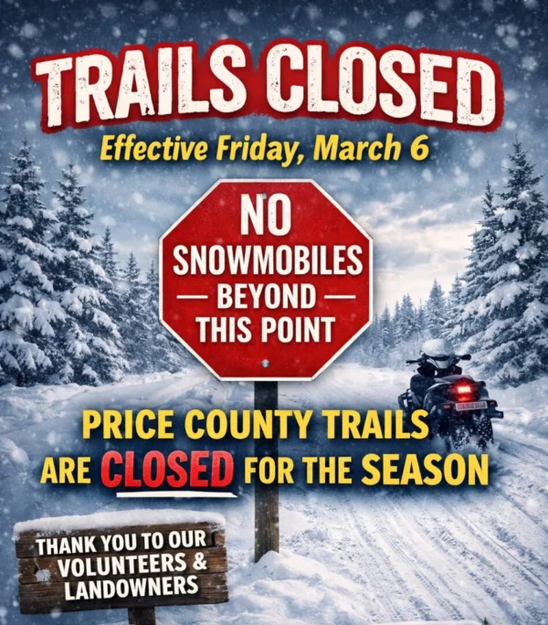 Price County, WI — Snowmobile trails across Price County will officially close for the season beginning Friday, March 6, as warmer temperatures and diminishing snow…