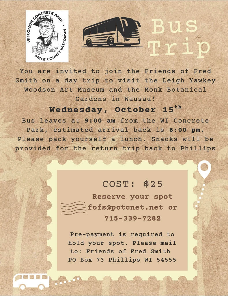 Bus leaves at 9:00 AM from the WI Concrete Park, estimated arrival back is 6:00 PM. Please pack yourself a lunch. Light snacks will be provided for the return trip back to Phillips.